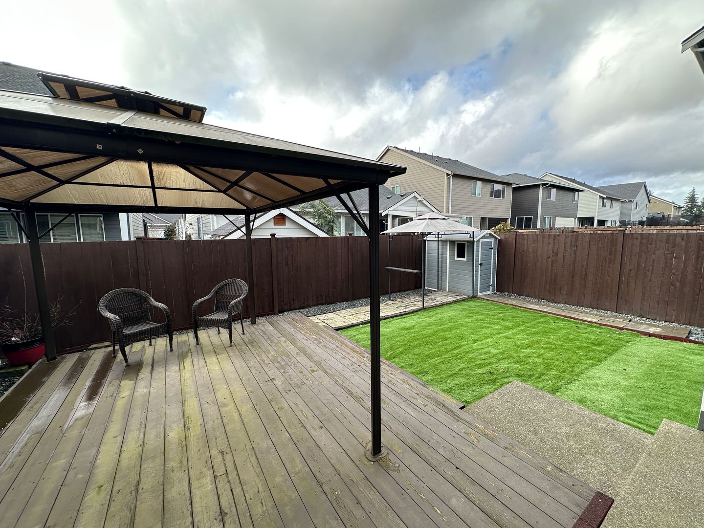 Introducing 9978 Dain Street SE, a charming 4-bedroom, 2.5-bathroom home located in the desirable area of Yelm, WA. This lovely house boasts a cozy gas fireplace, perfect for those chilly evenings, as well as air conditioning and ceiling fans to keep you comfortable year-round. With a 2-car attached garage, you'll have plenty of space for parking and storage. The lawn service is included, so you can enjoy a beautifully maintained yard without the hassle. Step outside to the backyard oasis, complete with faux turf and a large back patio, ideal for outdoor entertaining or simply relaxing in the fresh air. Don't miss out on the opportunity to make this house your home!